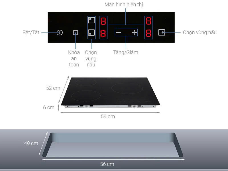 | Loại bếp | Bếp từ 3 vùng nấu, lắp âm |
