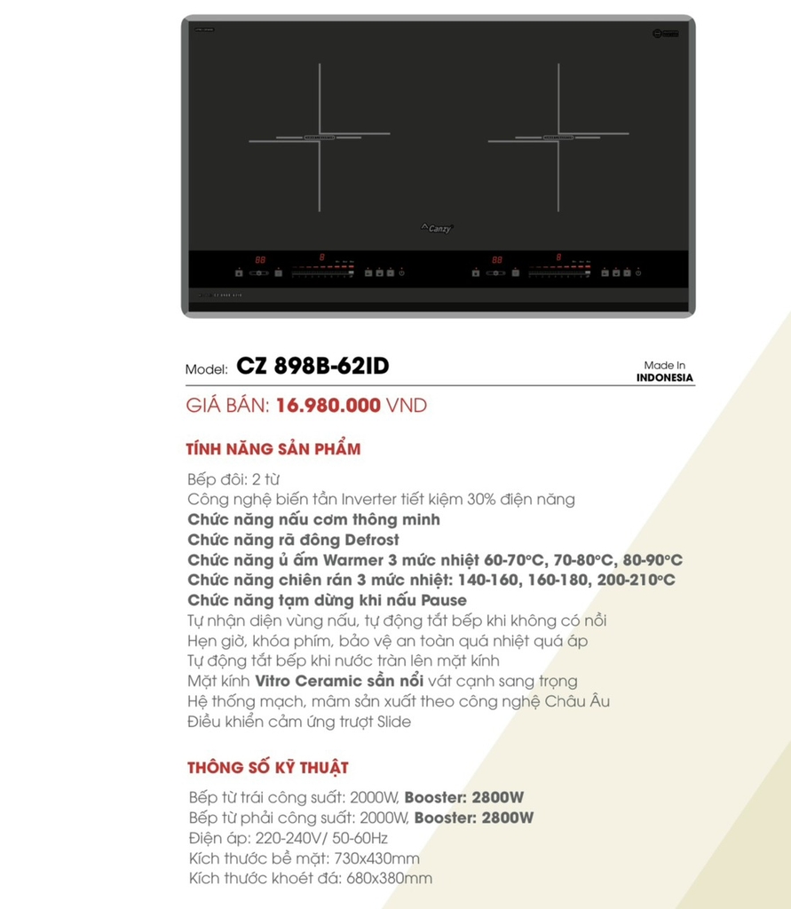 Đánh giá Bếp từ đôi Canzy CZ 898B-62ID
