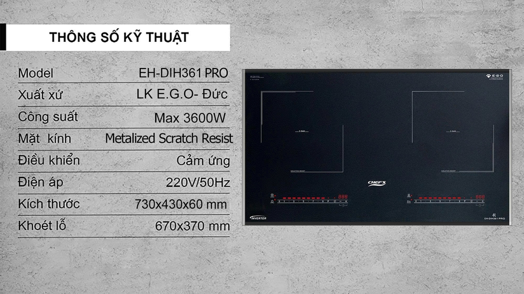 Bếp từ đôi Chef's EH-DIH361 PRO là dòng sản phẩm được ưa chuộng nhờ sự kết hợp giữa công nghệ châu Âu và quy trình sản xuất tại Việt Nam. Sản phẩm sử dụng linh kiện cao cấp từ E.G.O, mang đến độ bền cao, khả năng vận hành ổn định và hiệu suất nấu nướng tối ưu.