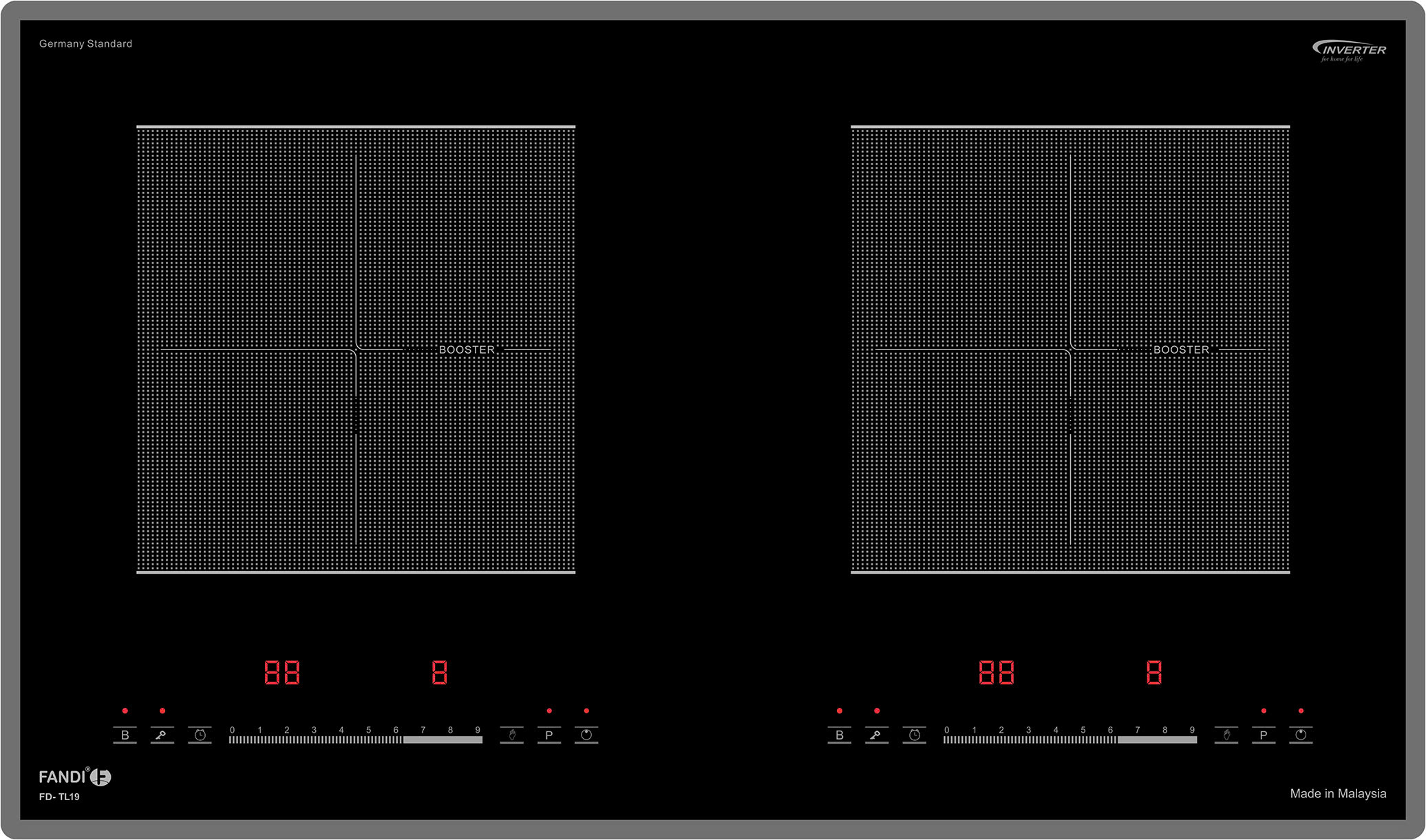 Bếp từ Fandi TL19 được nhập khẩu nguyên chiếc từ Malaysia, mang đến thiết kế tinh tế với mặt kính vát cạnh bo viền hợp kim cao cấp. Hai vùng nấu từ được bố trí rõ ràng, sử dụng ký hiệu vuông vắn hiện đại, tạo điểm nhấn hài hòa cho tổng thể không gian bếp. Sản phẩm còn được phủ lớp chống xước giúp mặt kính luôn sáng đẹp và bền bỉ theo thời gian.