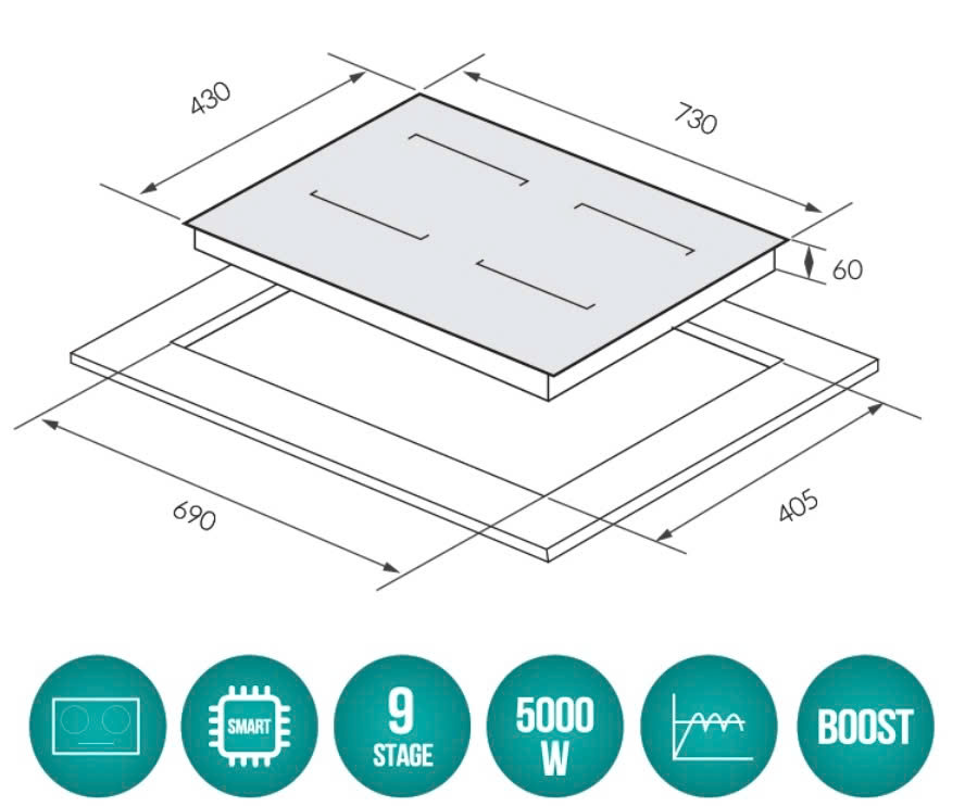 Kích thước bếp: 735R x 430S x 60C mm