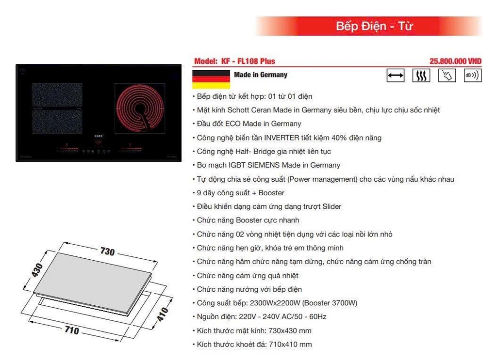 KAFF KF-FL108 PLUS New 2024 là mẫu bếp điện từ mới nhất của KAFF được nhập khẩu nguyên chiếc từ Đức. Với thiết kế sang trọng, bo viền hợp kim nhôm cao cấp cùng mặt kính Schott Ceran bền bỉ, sản phẩm không chỉ nâng tầm thẩm mỹ cho không gian bếp mà còn đảm bảo độ bền lâu dài theo thời gian.