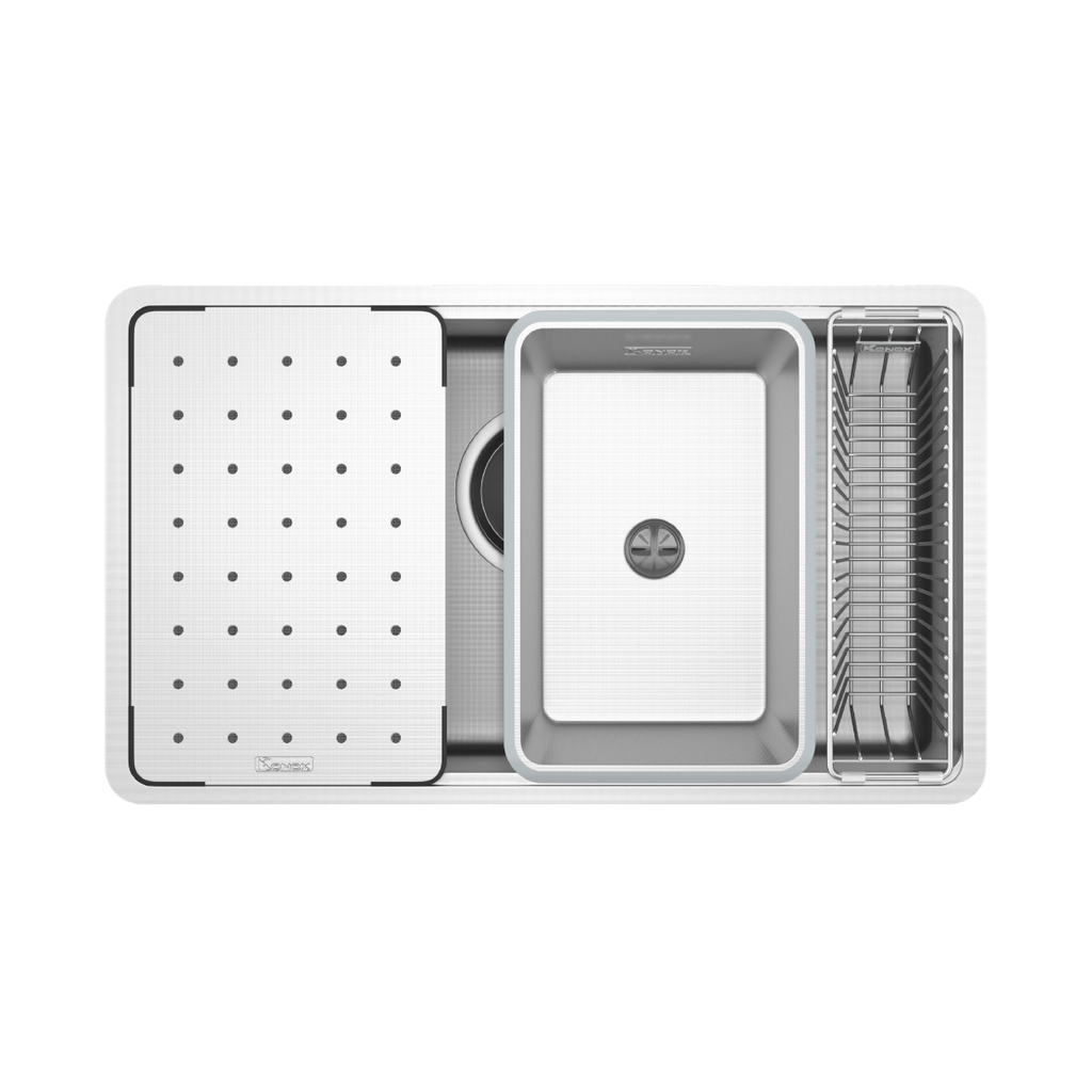 Một trong những ưu điểm nổi bật của Dekor 8044SU là bộ phụ kiện full set đi kèm, giúp biến khu vực chậu rửa thành một không gian sơ chế thực phẩm tiện lợi.