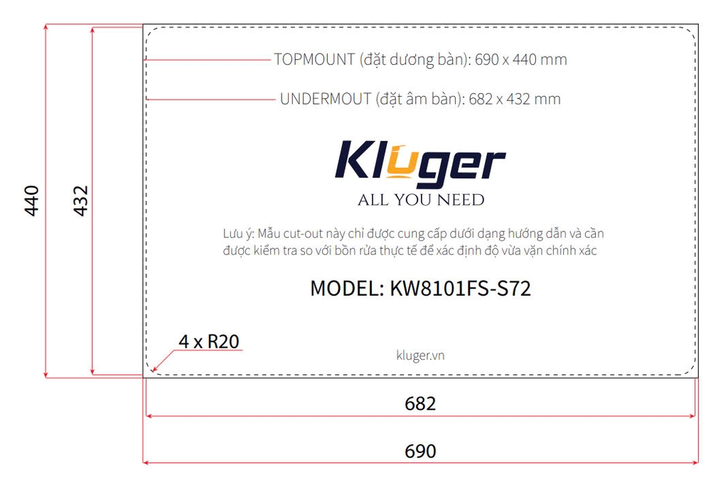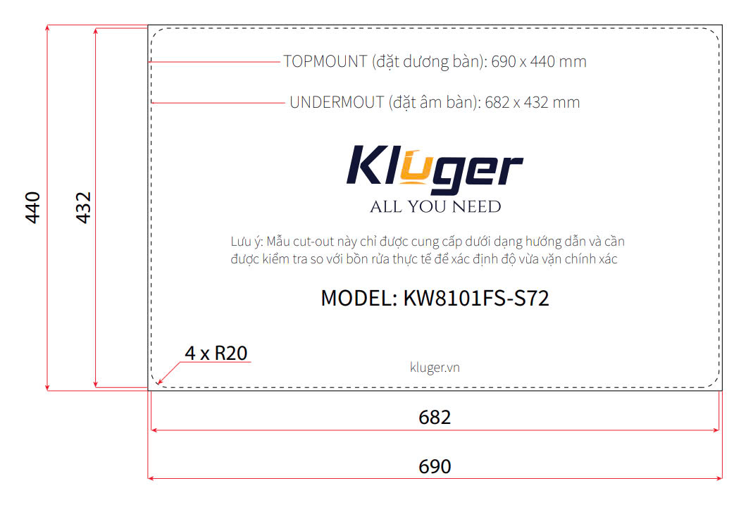 - Under Mount (Âm bàn): W682 x D432 (mm), bán kính góc 4 x R20.