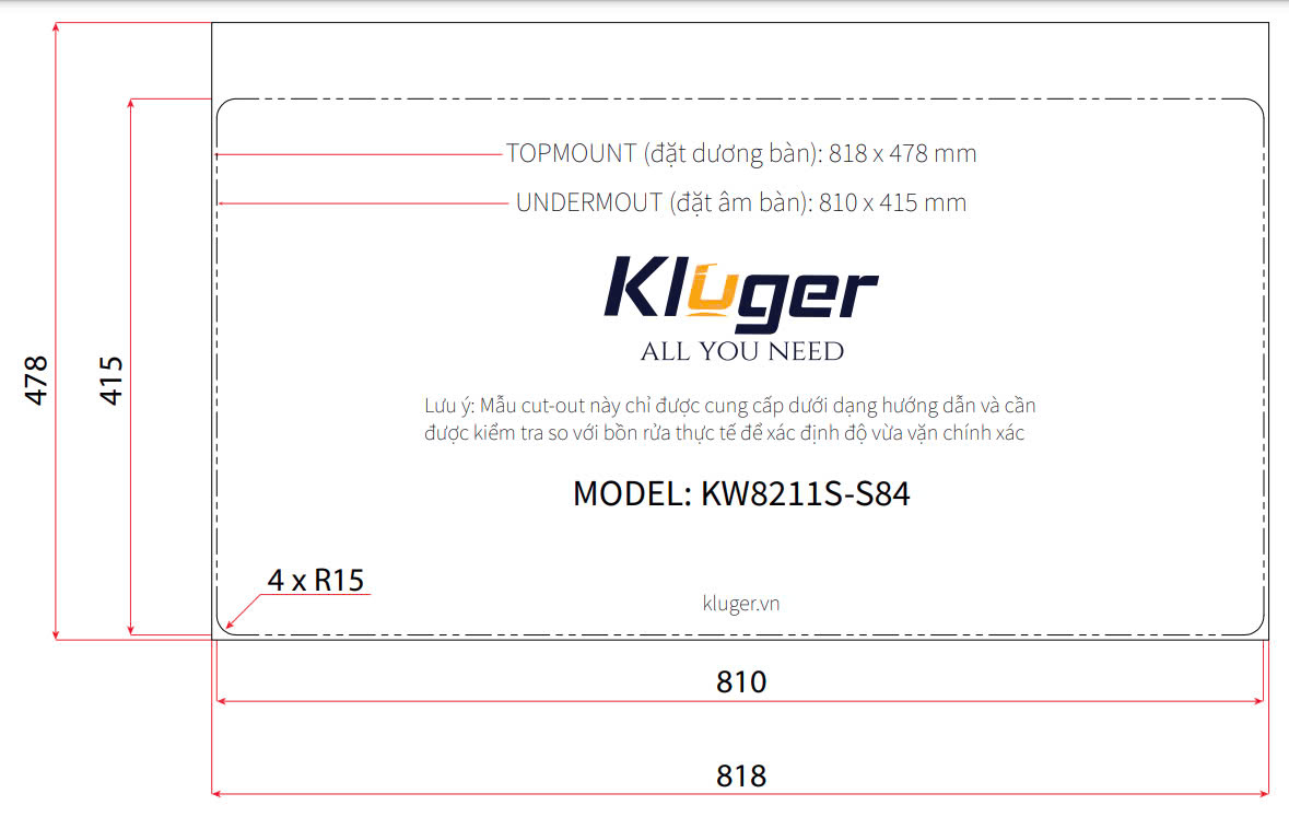 - Âm bàn (Under Mount): W810 x D415 mm (bo góc R15).