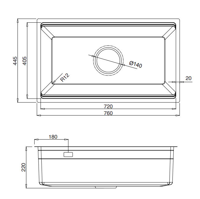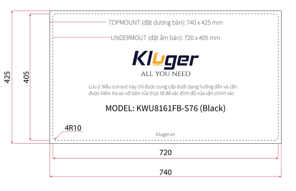 - Under Mount (Âm bàn): W720 x D405 (mm), bán kính góc 4 x R10.