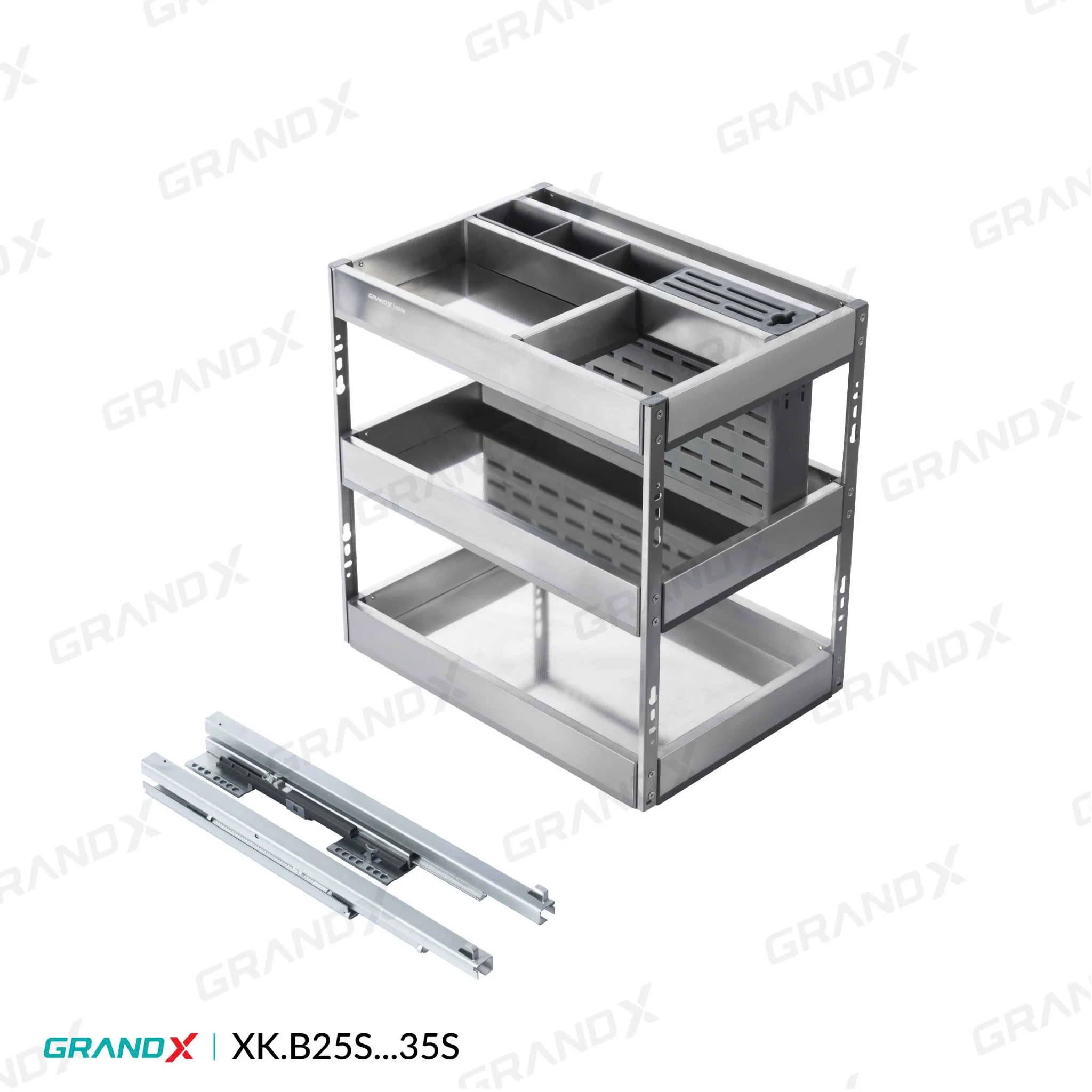 Với chiều rộng lọt lòng tủ tiêu chuẩn 350 mm, giá GrandX XK.B35S phù hợp với đa số thiết kế tủ bếp hiện đại. Thiết kế gọn gàng, dễ vệ sinh và tiện lợi cho thao tác hằng ngày.