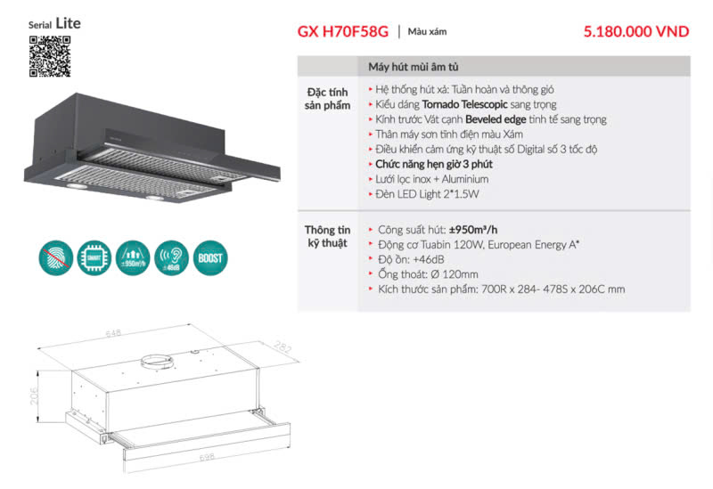 Công suất hút ±950 m³/h: Loại bỏ nhanh khói, mùi thức ăn và dầu mỡ.
