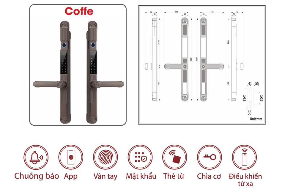 | Phương thức mở khóa | Vân tay, Mật khẩu, Thẻ từ, App Tuya, Chìa cơ, Điều khiển từ xa |