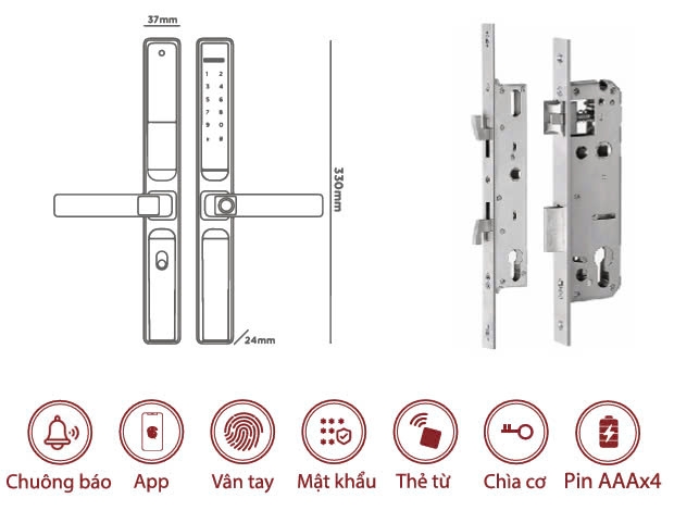 Kích thước thân khóa ngoài: 57xC330x24 mm