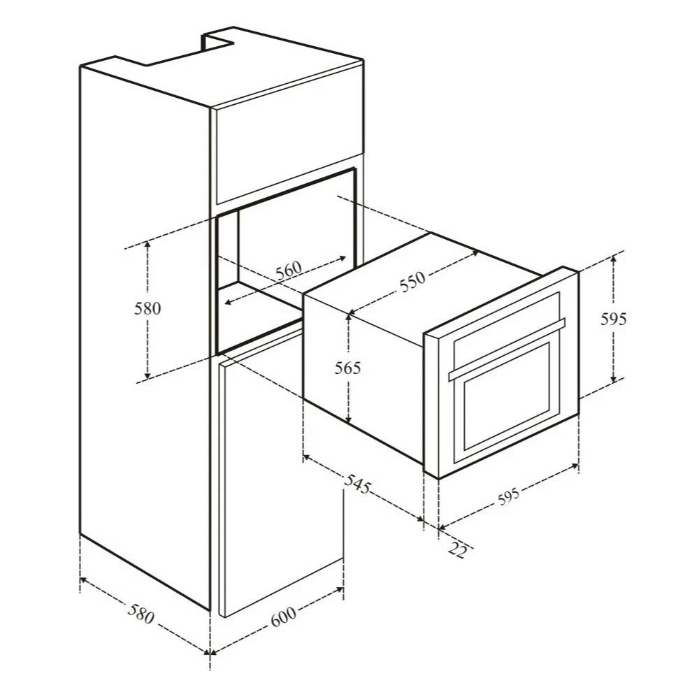 Kích thước tổng thể của lò là Rộng 595mm x Sâu 565mm x Cao 595mm, phù hợp với nhiều loại tủ bếp hiện đại. Kích thước khoét tủ tiêu chuẩn là R565 x S550 x C595mm, dễ dàng lắp đặt trong không gian bếp có sẵn.