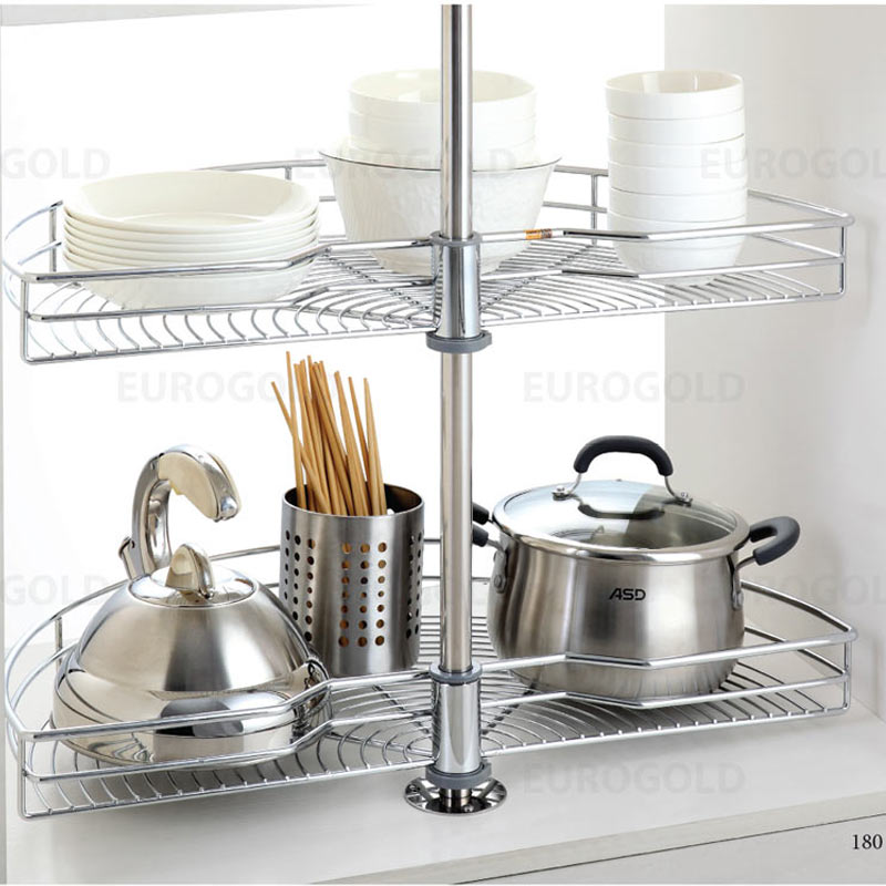 Mâm xoay góc tủ bếp được thiết kế với một trục cố định ở giữa và hai mâm inox nan có thể xoay 180 độ. Thiết kế này giúp bạn dễ dàng tiếp cận mọi vật dụng trong góc tủ mà không cần phải cúi người hay với tay xa.
