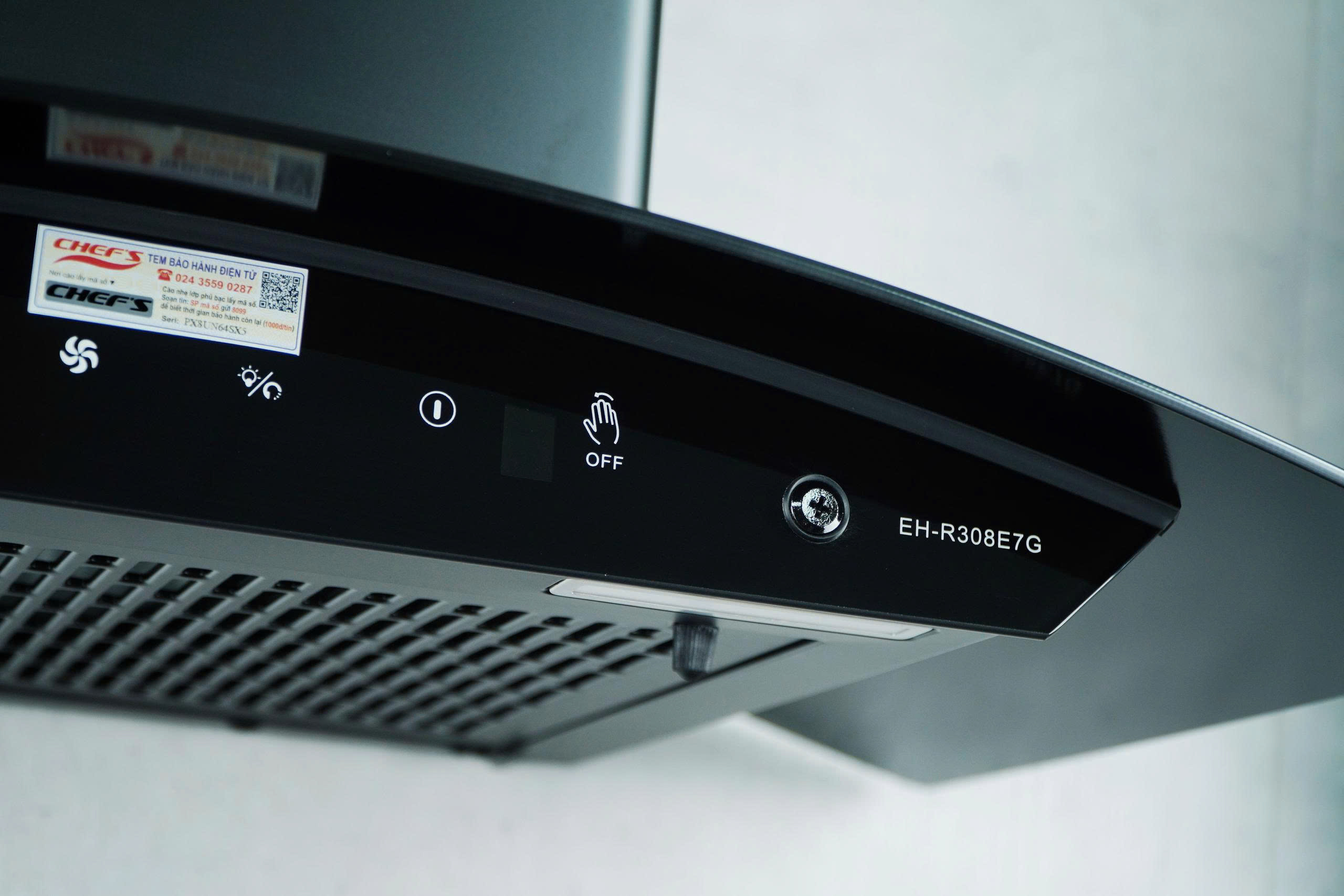 Máy hút mùi Chef's EH-R308E7G được trang bị bảng điều khiển cảm ứng Touchness với ba mức tốc độ hút, cho phép người dùng linh hoạt điều chỉnh theo từng nhu cầu nấu nướng. Ngoài ra, máy còn tích hợp công nghệ điều khiển bằng cử chỉ không chạm, giúp thao tác dễ dàng ngay cả khi tay ướt hoặc dính dầu mỡ.