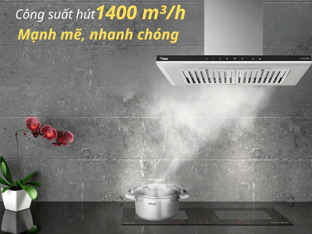 Máy được trang bị động cơ turbin đôi với công suất hút lên đến 1400 m³/h, loại bỏ nhanh chóng khói, mùi thức ăn và hơi dầu mỡ, giúp không khí bếp luôn trong lành. Đặc biệt, máy hỗ trợ cả 2 chế độ hút:
