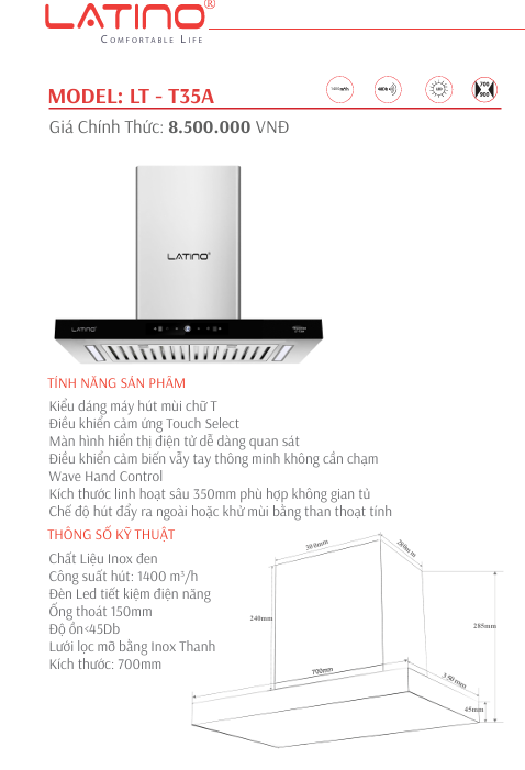Thông Số Kỹ Thuật Máy Hút Mùi LATINO LT-T35A