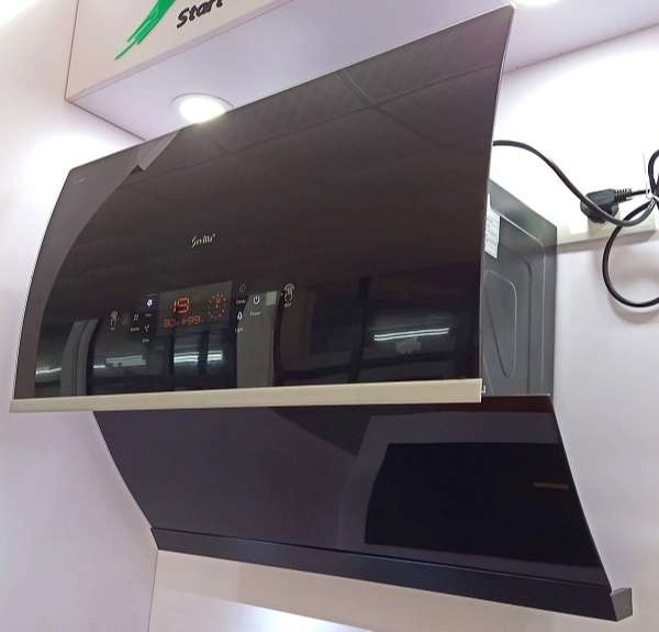 - Thiết Kế Hiện Đại: Máy hút mùi gắn tường với kiểu dáng kính vát nghiêng cong, mang lại sự sang trọng và tinh tế cho không gian bếp.