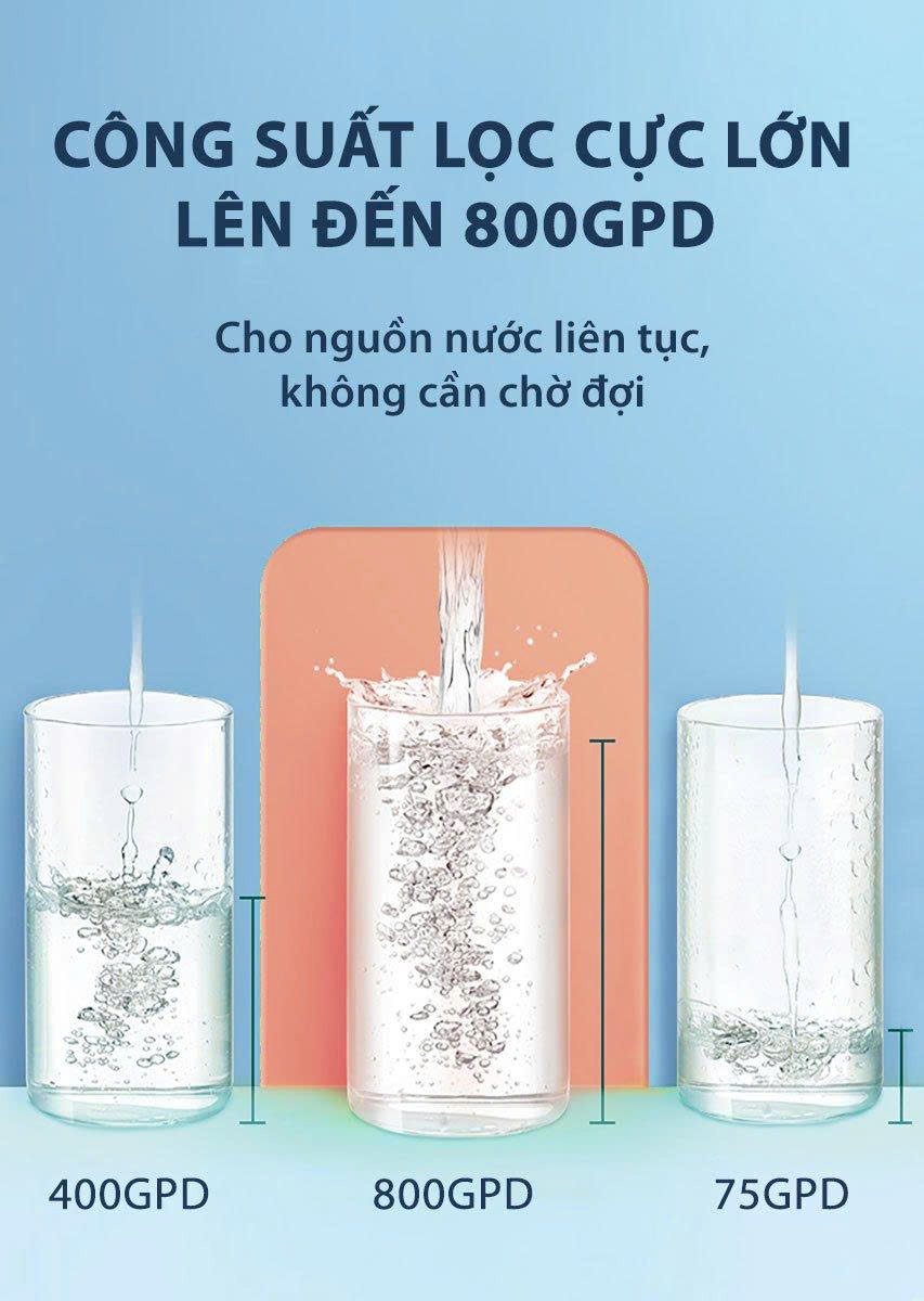 Công suất lọc khủng – 800 GPD (~3.000 lít/ngày) đáp ứng liên tục nhu cầu của nhiều người.