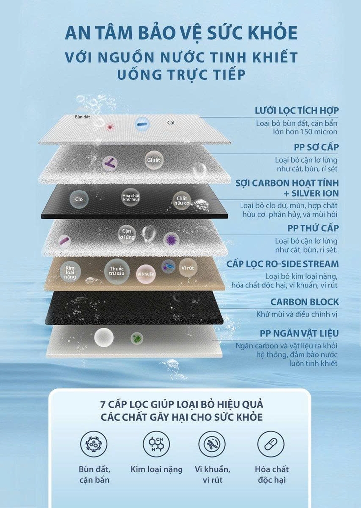 Kết hợp các lõi lọc thô, lõi than hoạt tính và màng RO để mang lại nguồn nước tinh khiết chuẩn uống trực tiếp.