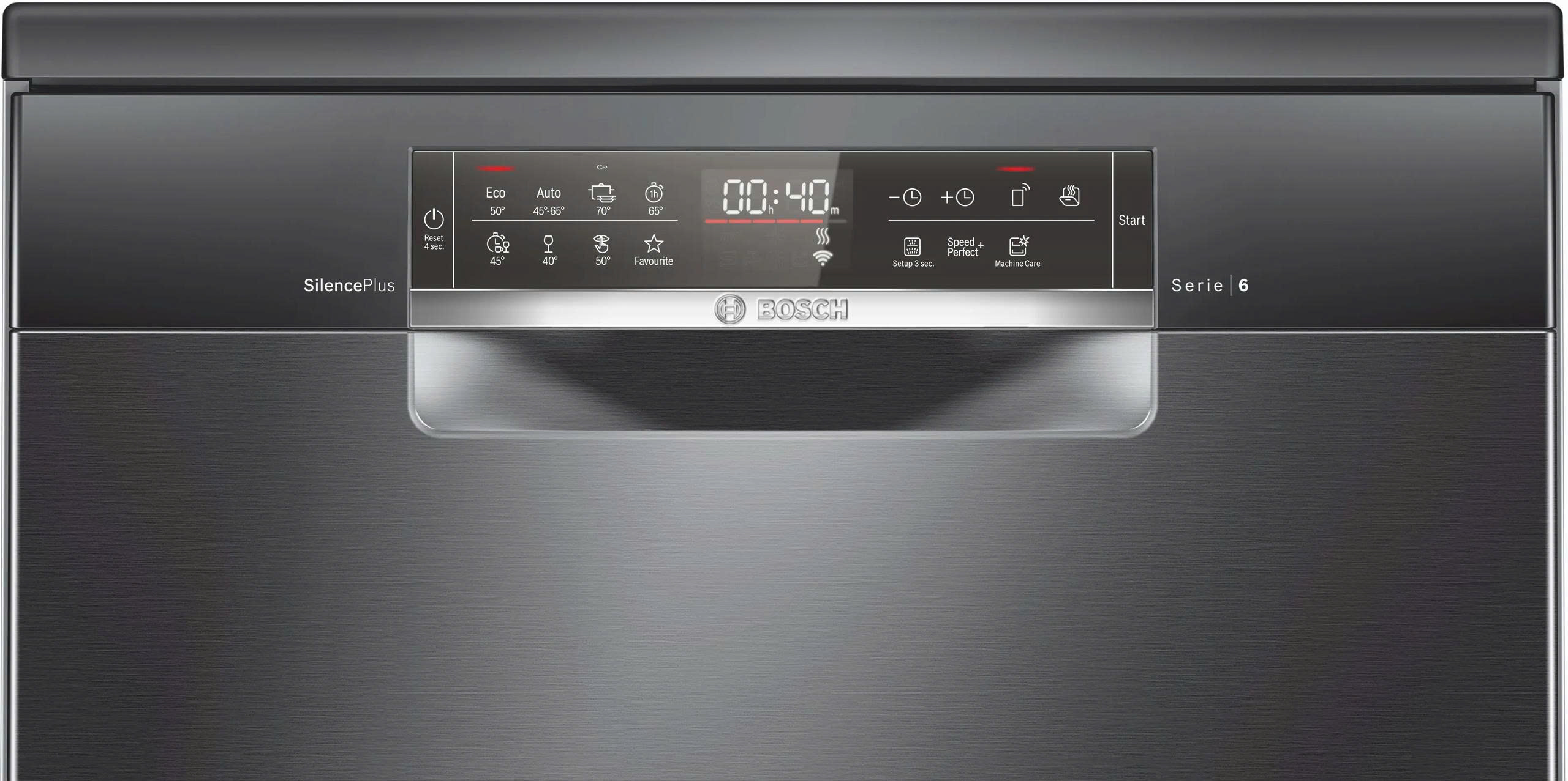 Máy rửa bát Bosch SMS6ECC51E thuộc dòng Serie 6 cao cấp với kiểu dáng độc lập, dễ dàng lắp đặt trong mọi không gian bếp mà không cần đóng tủ. Bề mặt máy được phủ màu đen nhám hiện đại, sang trọng và dễ vệ sinh. Bảng điều khiển cảm ứng kết hợp màn hình LED lớn giúp người dùng thao tác thuận tiện, hiển thị rõ ràng các chương trình, thời gian còn lại và trạng thái vận hành.