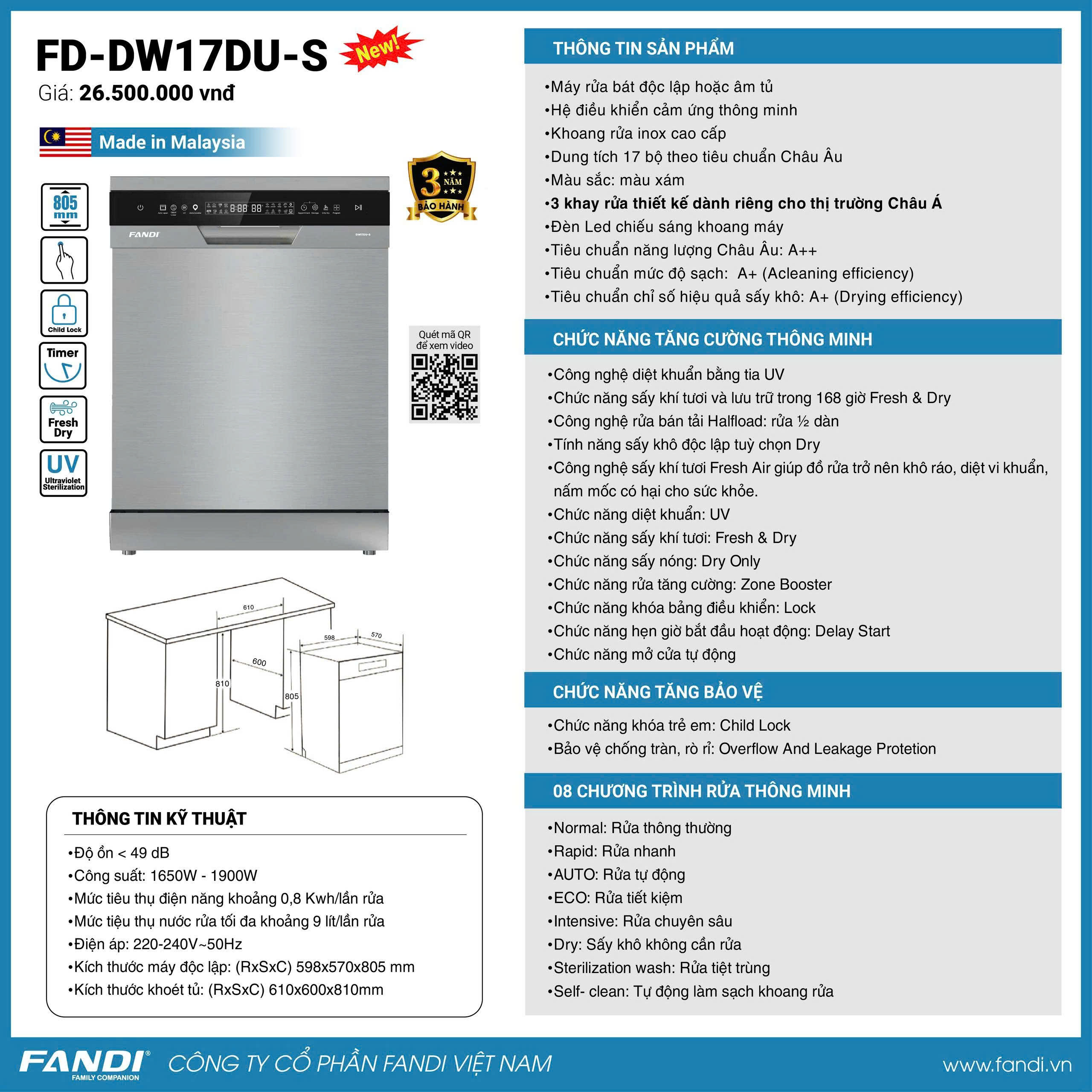 Máy Rửa Bát FANDI FD-DW17DU-S 17 Bộ – Diệt Khuẩn UV, Sấy Fresh & Dry 168 Giờ, Tiết Kiệm Điện A++