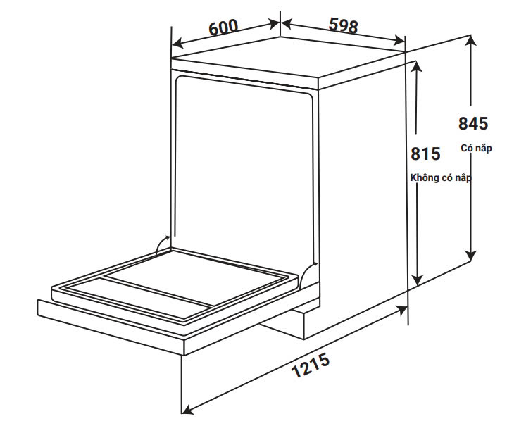 Kích thước: 598R x 600S x 815 (không nắp) / 845 (có nắp) mm, tối ưu hóa diện tích lắp đặt.