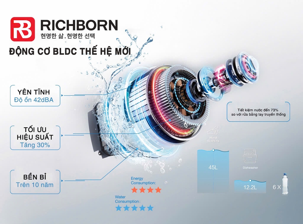 Máy rửa bát RICHBORN RDG6063-S8 Ultra trang bị động cơ BLDC thế hệ mới – công nghệ tiên tiến được các thương hiệu hàng đầu như Bosch hay Hafele sử dụng. Động cơ này giúp máy vận hành êm ái, tiết kiệm điện nước, đồng thời nâng cao hiệu suất làm sạch vượt trội.