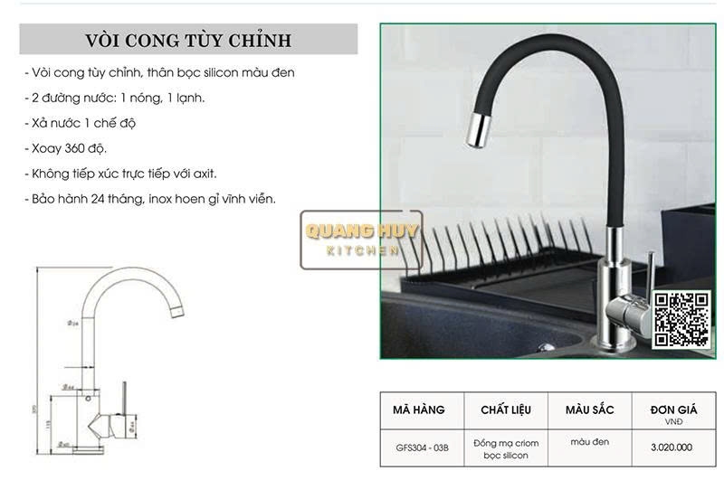 Vòi cong tuỳ chỉnh GFS304-03B inox 304 là sự kết hợp hoàn hảo giữa công nghệ hiện đại, vật liệu cao cấp và thiết kế tiện dụng. Đây không chỉ là một chiếc vòi rửa đơn thuần mà còn là thiết bị hỗ trợ đắc lực cho người nội trợ trong căn bếp, đồng thời góp phần nâng tầm giá trị thẩm mỹ cho không gian sống.