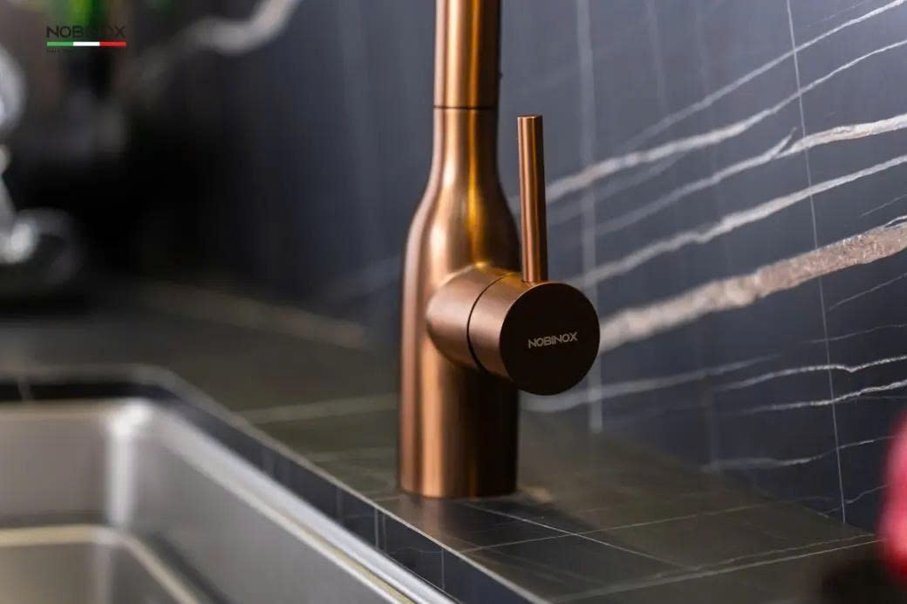 Trong dòng sản phẩm AQUA, nơi đề cao sự cân bằng giữa thẩm mỹ và công năng, vòi rửa bát dây rút Nobinox AQUA NX662T nổi bật với sắc đồng ấm áp. Sản phẩm này không chỉ tạo điểm nhấn khác biệt cho không gian bếp mà còn mang đến sự sang trọng và tinh tế, giúp khu vực chậu rửa trở nên hoàn hảo hơn trong tổng thể nội thất.