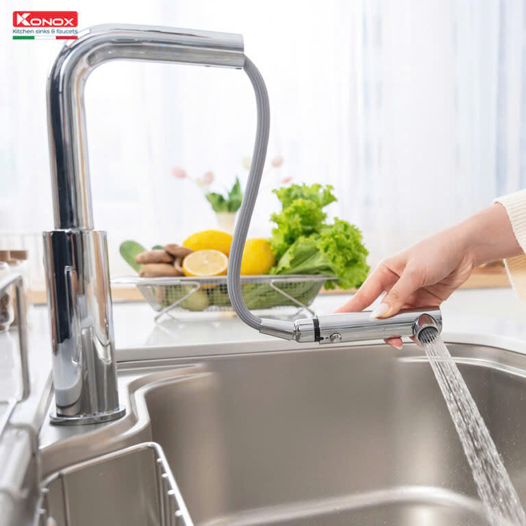Đầu vòi kéo dây tiện lợi: Tăng phạm vi làm việc đến 76cm, thuận tiện cho việc rửa thực phẩm và vệ sinh chậu.