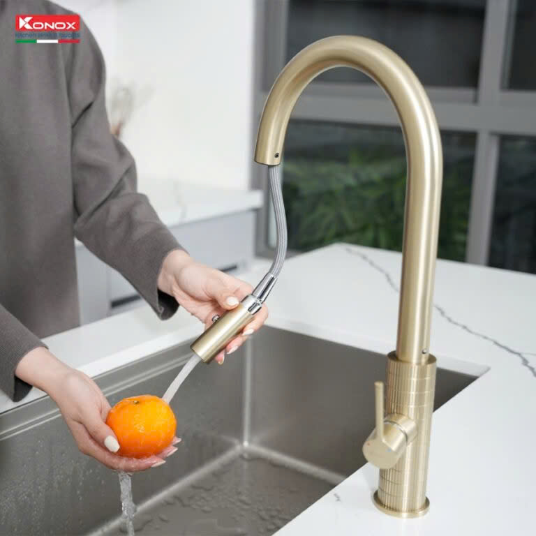 Vòi rửa bát Venice Gold là sự kết hợp hoàn hảo giữa thiết kế bo tròn mềm mại và sắc vàng sang trọng, tạo điểm nhấn đẳng cấp cho không gian bếp. Kiểu dáng tay vòi ngang không chỉ tối ưu diện tích mà còn nâng tầm thẩm mỹ cho bàn bếp hiện đại.