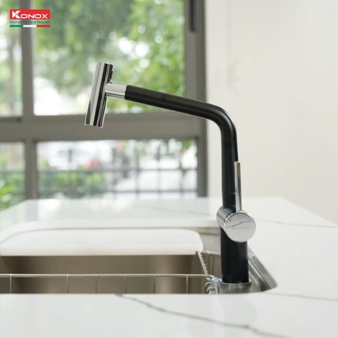 Vòi rửa bát Konox Volta Black sở hữu kiểu dáng thẳng đứng bo góc khỏe khoắn, đầu vòi hình chữ T hiện đại, mang đến phong cách mạnh mẽ cho không gian bếp. Tay vòi ngang cùng đầu rút dây kéo linh hoạt giúp tối ưu hóa mọi thao tác rửa, dù ở bất kỳ góc nào.