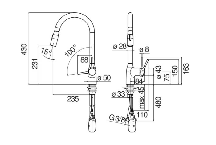 Vòi bếp MANIA NB308G có chiều cao 430mm cùng kiểu dáng mềm mại, hiện đại. Phần thân vòi xoay linh hoạt 180 độ, đầu vòi dây rút có thể kéo ra xa và thu gọn lại dễ dàng, giúp tiếp cận mọi góc của bồn rửa mà không cần di chuyển nồi chảo.