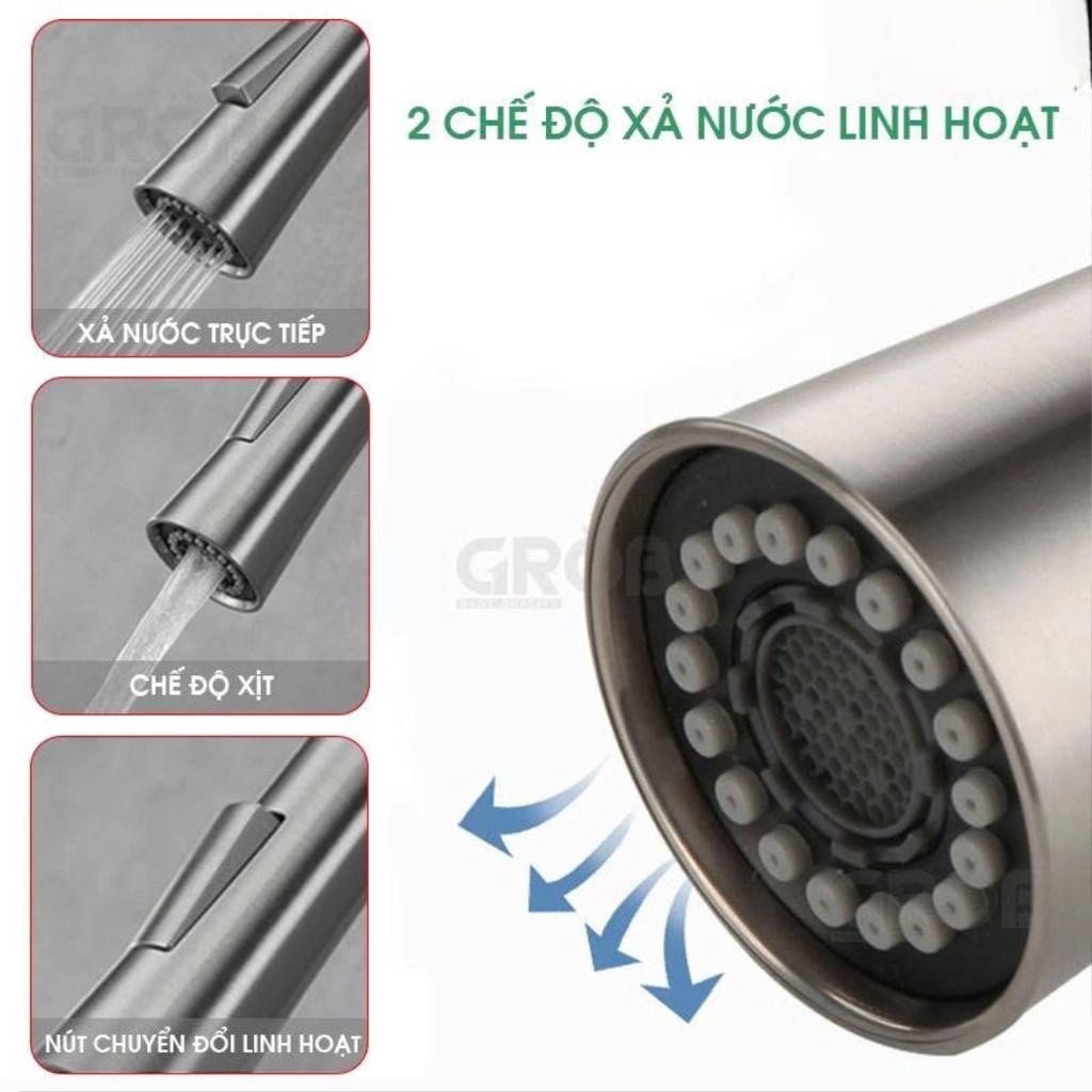 Điểm khác biệt của GFS304.01 chính là đầu vòi rút dây thông minh, có thể kéo dài ra để rửa toàn bộ bồn, rửa rau củ quả, chén đĩa, hoặc đồ dùng có kích thước lớn. Sau khi sử dụng, đầu vòi tự động thu lại nhờ lò xo đàn hồi và trọng lực dây chì bên dưới – thao tác nhẹ nhàng, không cần dùng lực lớn.